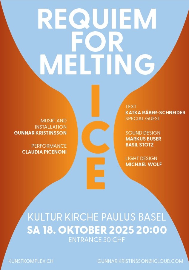 Katka Räber-Schneider liest im Rahmen des Kultur-Events «Requiem for melting ice» Texte zum Thema Gletscherschmelze. Die Veranstaltung ist eine Weiterführung von vorausgegangen Stücken, welche in den letzten Jahren uraufgeführt wurden. Das Thema des Gesamtkunstwerkes ist immer das gleiche. Die Interpretation und Gestaltung des Werkes lässt sich jedoch immer wieder neu kreieren. Der Event umfasst Installationen, Licht und Sound, Musik, Performance und Text. Eintritt: CHF 30.- Mehr dazu: kunstkomplex.ch